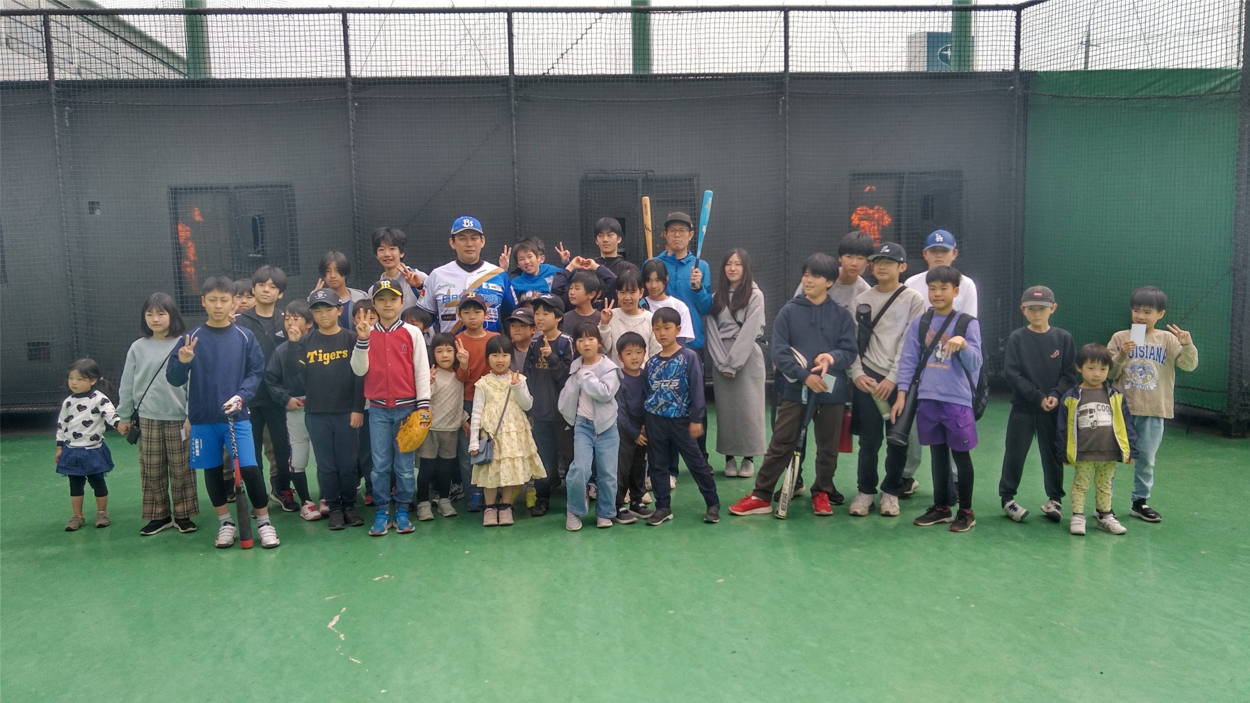 令和8年3月22日(日)元阪神タイガース外野手の桜井広大プロを招き、施設全部を使って野球教室を実施しました。保護者を含めた総数70名強の参加者が、晴天の中、2時間のあいだ、バッティングレッスンを始め、抽選会や集合写真撮影会、サイン会と、皆様と一緒に楽しんでいただきました。本日のイベントでは、たくさんの方が初参加とのことで、桜井プロより、やさしくわかりやすい指導後、後半は指導内容を実践するフリーバッティングの時間も設け、楽しい時間を過ごしました。